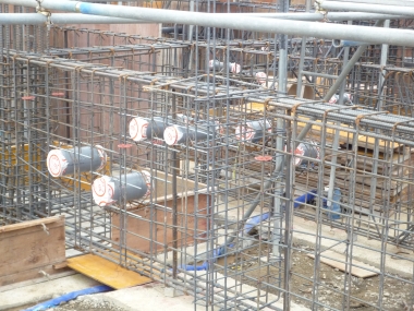 塩化ビニール管がいくつも鉄筋に固定されている